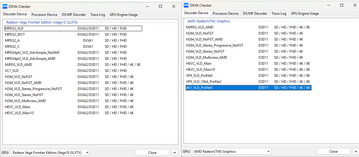 AMD Ryzen 7000 시리즈의 iGPU (AMD Radeon(TM) Graphics에서 AV1 하드웨어 디코딩이 확인 됨