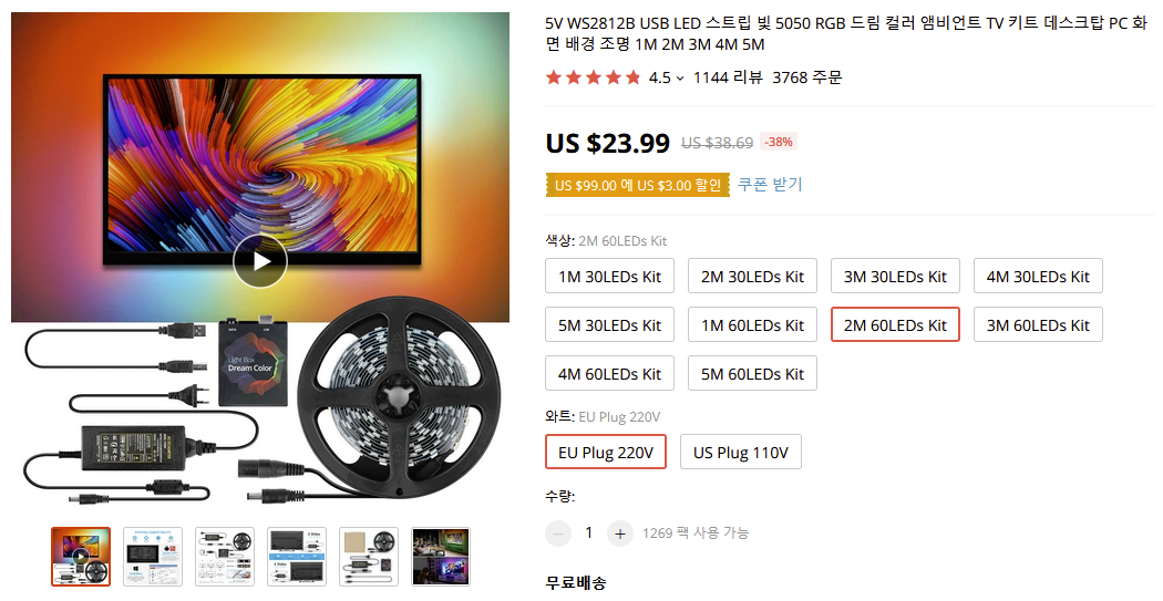Aliexpress를 통해 구매했고, 선택 가이드에 따라 제 모니터 (27인치, DELL U2711)의 사이즈에 맞게 "2M + 60LED" 옵션선택 약 27,000원 가량으로 구매 했습니다. 구성품은 1) LED 스트립 (WS2812B) 2) 컨트롤러 (Arduino UNO) 3) 파워 서플라이 (라인 길이 따라 용량 다름) 4) USB 케이블입니다. 컴퓨터와는 USB 포트 (COM Port 에뮬레이션)를 통해 연결 되며 범용 소프트웨어인 Ambibox (혹은 Prismatik) 을 통해 연동할 수 있습니다.