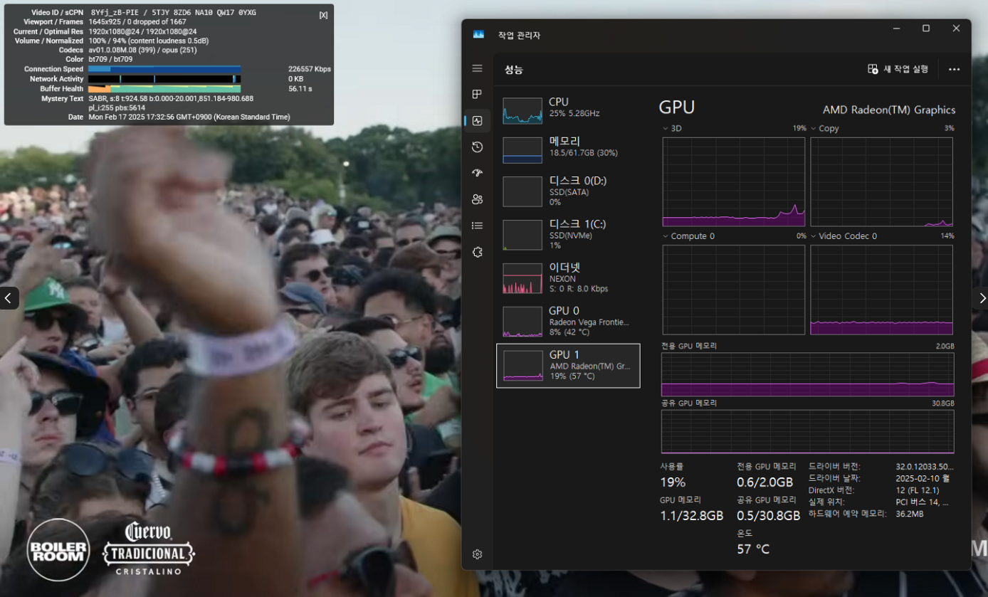 Youtube 에서 트래픽 절약을 위해 8K 이상 비디오 또는 라이브 스트리밍 영상들은 대부분 Av1으로 전송하는 것 같음. 비디오 재생 중에 마우스 오른쪽 클릭 -> 전문 통계 (Status for nerds) 를 클릭하면 현재 재생중인 비디오의 코덱 및 프레임 정보를 확인 할 수 있음. (Codecs : av01) 작업 관리자의 Video Codec 0 에서 AV1 하드웨어 디코딩 상태를 확인할 수 있음 (nVidia / INTEL 은 Video Decode 항목으로 표시 됨, AMD 와 nVidia/INTEL의 드라이버에서 표시 해주는 이름이 서로 다름. 아... 근데 Windows 11 작업관리자는 Video Codec 0으로 선택 해두기만 하면 초기화 하냐...)