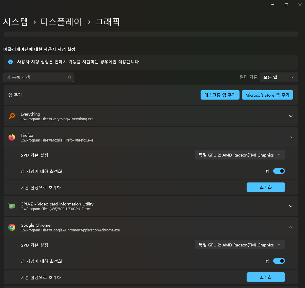 Windows 10/11 설정에서 프로세스 별로 특정 GPU (iGPU)를 강제로 지정. 이는 웹브라우저에서 GPU를 활용하겠다는 의미임